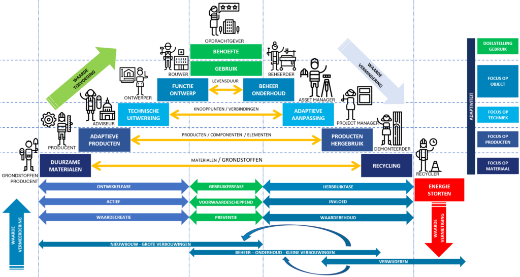 Circulair ontwerpen is, in het proces, het regisseren van elementen en het organiseren van vertrouwen, samenwerken en innoveren. Het bouwwaardenmodel is de basis van het bouwwaardensysteem. Het is integraal, strategisch en tactisch van aard en een goede ‘praatplaat’ voor elk bedrijf en/of team in de B&U- en infrasector om aan te kunnen geven wáár in het proces men staat, welke impact je wil maken, welke handelings-perspectieven er zijn, welke rol en verantwoordelijkheid met moreel kompas men wil nemen, welke attitude men heeft, waar hun producten (in verschillende levensfases) zich bevinden, hoe deze te demonteren zijn en gereed zijn voor adaptatie in de keten.