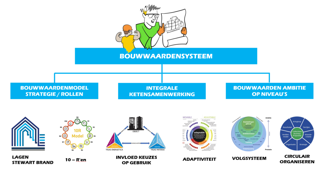 Het gaat bij het bouwwaardensysteem om systeemdenken. Het is een benadering die tracht overzicht van het geheel te behouden, in plaats van zich te concentreren op afzonderlijke onderdelen. Bij de ontwikkeling zoek je naar vaste patronen in het bouwproces om die waar nodig te doorbreken met een blijvende oplossing in plaats van probleemoplossend te handelen. het welzijn van mens en dier. Hier en daar, nu en later. Hiervoor gebruiken we het bouwwaardenmodel. Met het bouwwaardensysteem kan je jouw strategie en ambitie bepalen. Bij het gebruik zie je dat de S-lagen, de 10-R’en, de invloed op het gebruik, adaptiviteit, het volgsysteem en circulair organiseren een onlosmaakbaar onderdeel zijn.